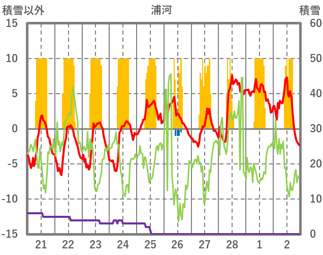 | 日 | 時 | 気温 | 降水 | 風向/風速 | 日照 | 積雪 | 降雪 |