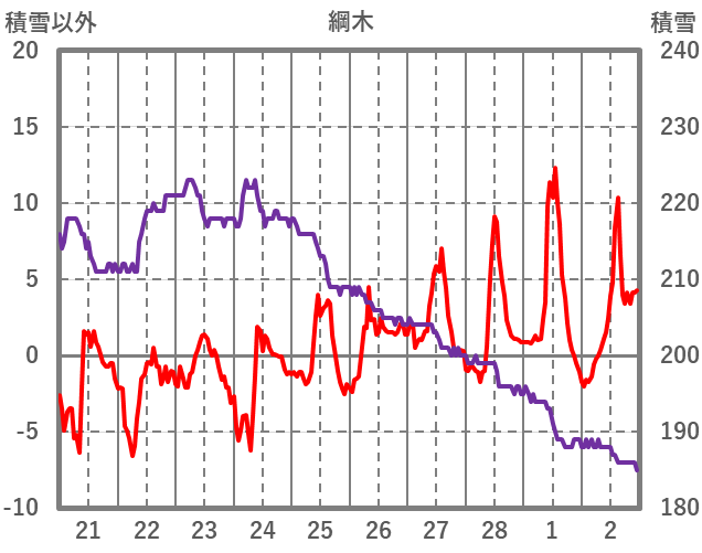 | 日 | 時 | 気温 | 降水 | 風向/風速 | 日照 | 積雪 | 降雪 |