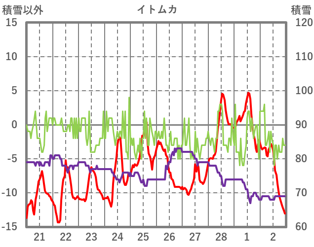 | 日 | 時 | 気温 | 降水 | 風向/風速 | 日照 | 積雪 | 降雪 |
