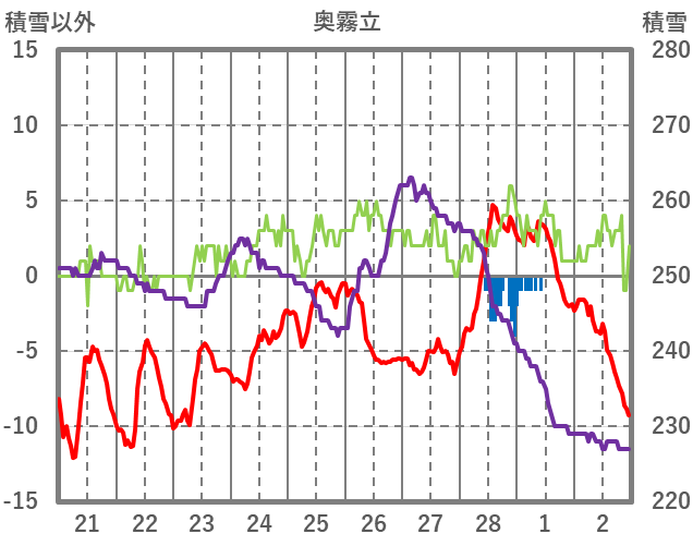 | 日 | 時 | 気温 | 降水 | 風向/風速 | 日照 | 積雪 | 降雪 |