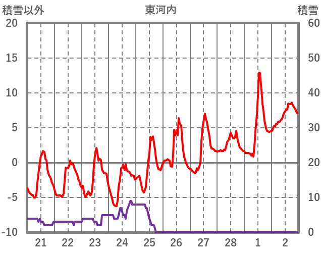 | 日 | 時 | 気温 | 降水 | 風向/風速 | 日照 | 積雪 | 降雪 |