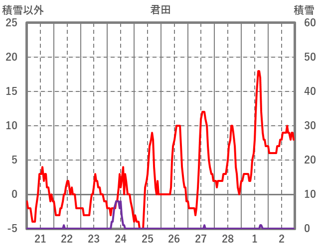 | 日 | 時 | 気温 | 降水 | 風向/風速 | 日照 | 積雪 | 降雪 |