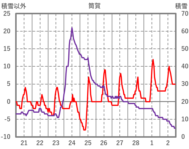 | 日 | 時 | 気温 | 降水 | 風向/風速 | 日照 | 積雪 | 降雪 |