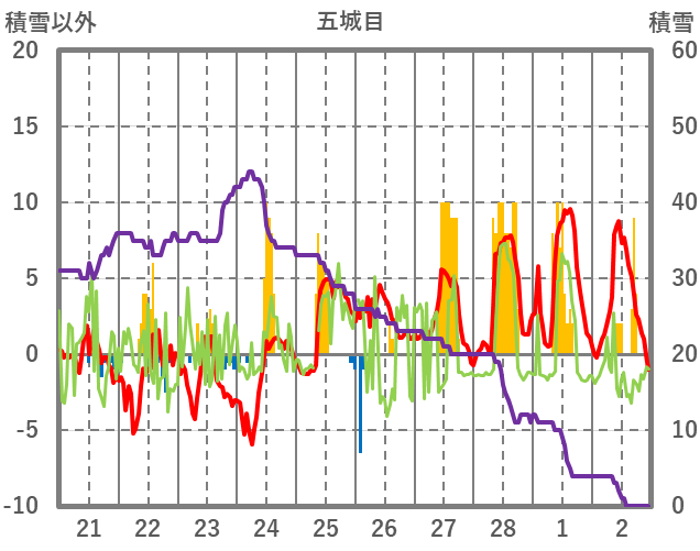 | 日 | 時 | 気温 | 降水 | 風向/風速 | 日照 | 積雪 | 降雪 |