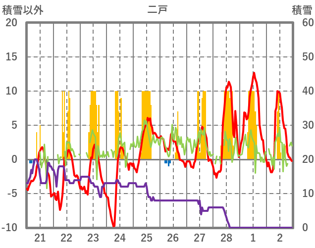 | 日 | 時 | 気温 | 降水 | 風向/風速 | 日照 | 積雪 | 降雪 |