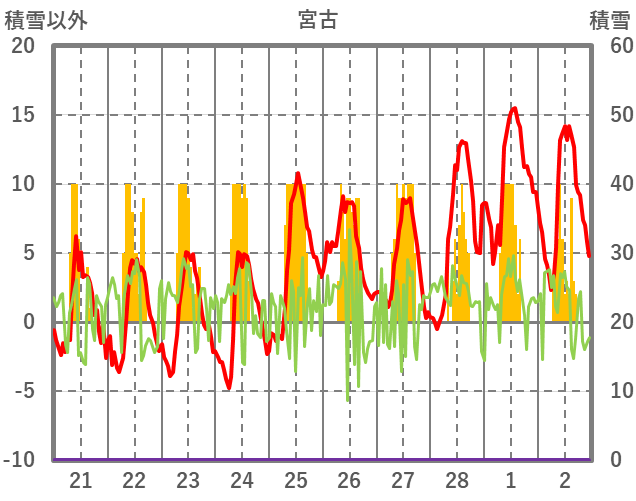 | 日 | 時 | 気温 | 降水 | 風向/風速 | 日照 | 積雪 | 降雪 |