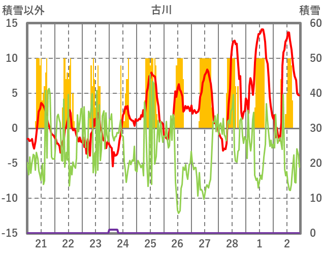 | 日 | 時 | 気温 | 降水 | 風向/風速 | 日照 | 積雪 | 降雪 |