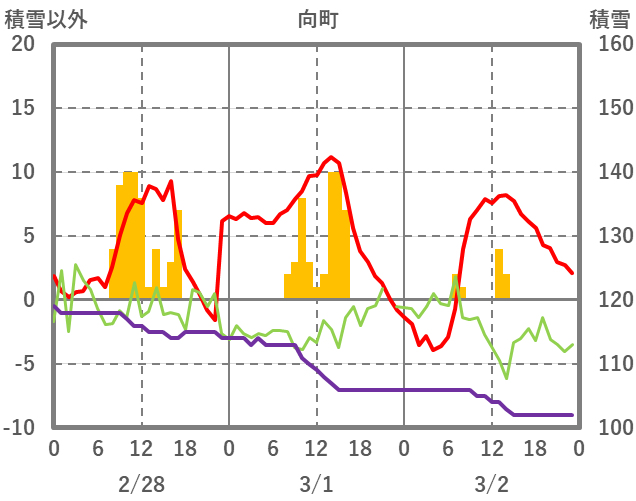 | 日 | 時 | 気温 | 降水 | 風向/風速 | 日照 | 積雪 | 降雪 |