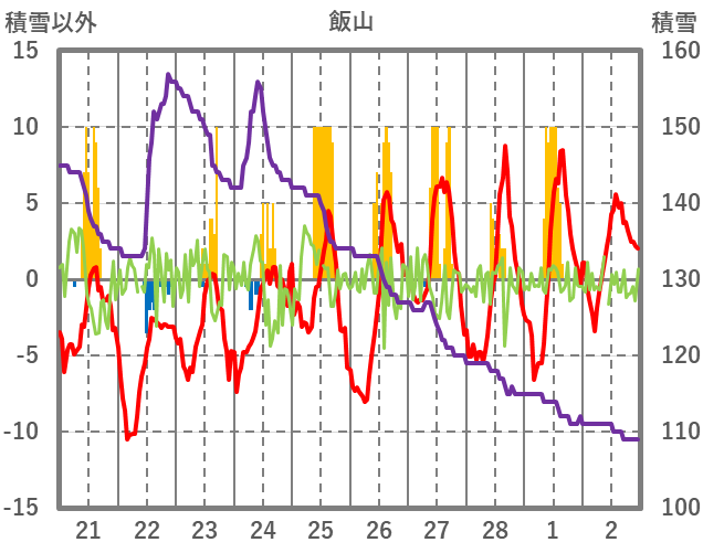 | 日 | 時 | 気温 | 降水 | 風向/風速 | 日照 | 積雪 | 降雪 |
