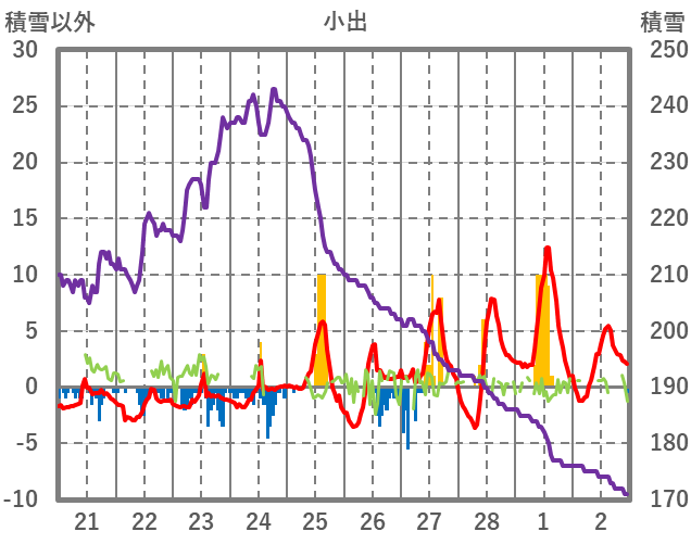 | 日 | 時 | 気温 | 降水 | 風向/風速 | 日照 | 積雪 | 降雪 |