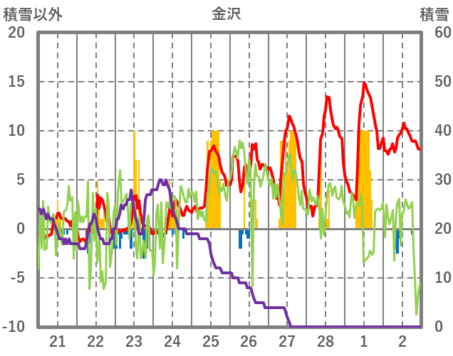 | 日 | 時 | 気温 | 降水 | 風向/風速 | 日照 | 積雪 | 降雪 |