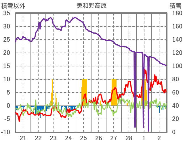 | 日 | 時 | 気温 | 降水 | 風向/風速 | 日照 | 積雪 | 降雪 |