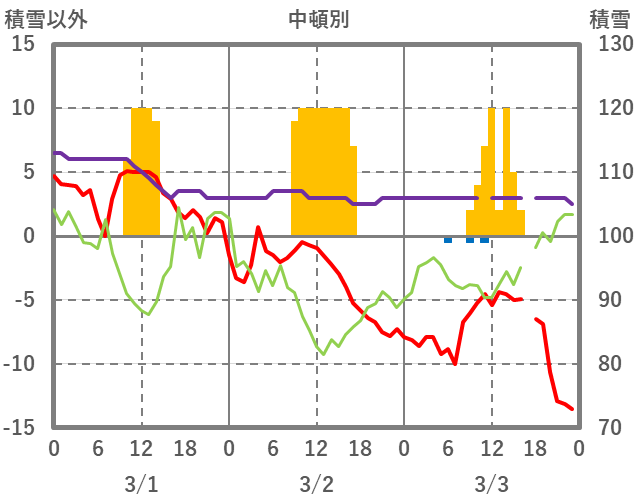 | 日 | 時 | 気温 | 降水 | 風向/風速 | 日照 | 積雪 | 降雪 |