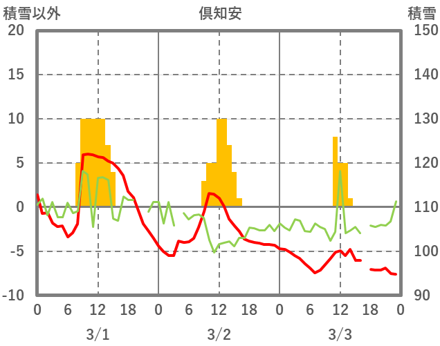 | 日 | 時 | 気温 | 降水 | 風向/風速 | 日照 | 積雪 | 降雪 |
