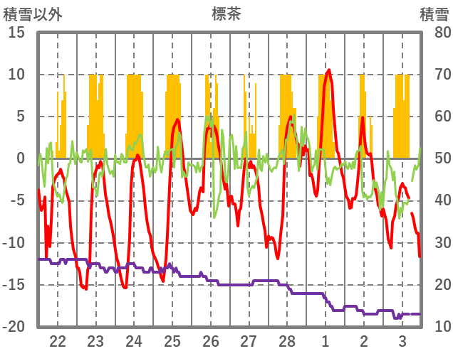 | 日 | 時 | 気温 | 降水 | 風向/風速 | 日照 | 積雪 | 降雪 |