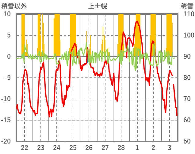 | 日 | 時 | 気温 | 降水 | 風向/風速 | 日照 | 積雪 | 降雪 |