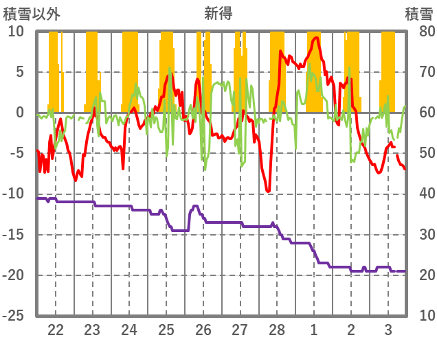 | 日 | 時 | 気温 | 降水 | 風向/風速 | 日照 | 積雪 | 降雪 |