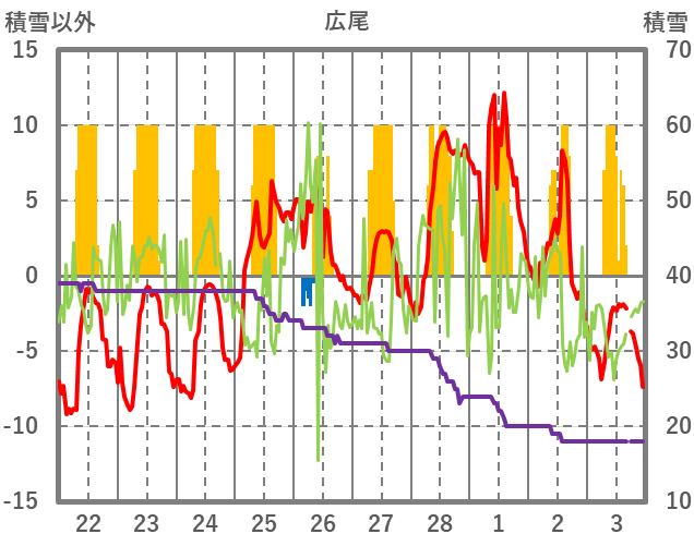 | 日 | 時 | 気温 | 降水 | 風向/風速 | 日照 | 積雪 | 降雪 |