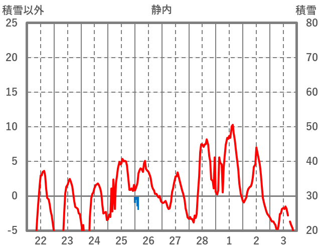 | 日 | 時 | 気温 | 降水 | 風向/風速 | 日照 | 積雪 | 降雪 |