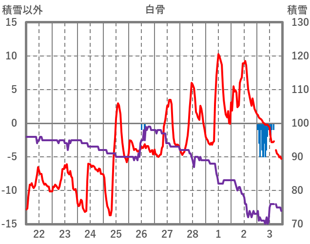 | 日 | 時 | 気温 | 降水 | 風向/風速 | 日照 | 積雪 | 降雪 |