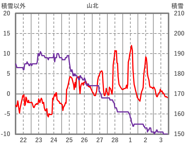 | 日 | 時 | 気温 | 降水 | 風向/風速 | 日照 | 積雪 | 降雪 |