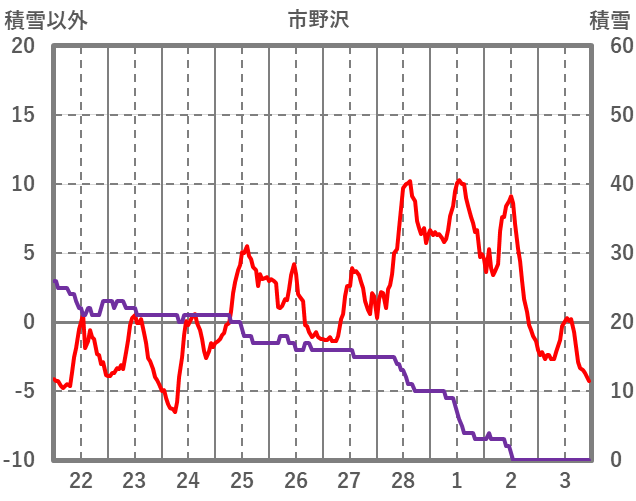 | 日 | 時 | 気温 | 降水 | 風向/風速 | 日照 | 積雪 | 降雪 |