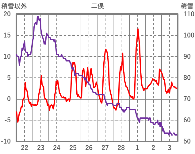 | 日 | 時 | 気温 | 降水 | 風向/風速 | 日照 | 積雪 | 降雪 |