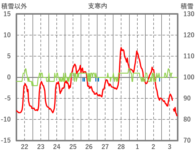 | 日 | 時 | 気温 | 降水 | 風向/風速 | 日照 | 積雪 | 降雪 |
