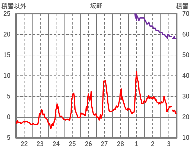 | 日 | 時 | 気温 | 降水 | 風向/風速 | 日照 | 積雪 | 降雪 |
