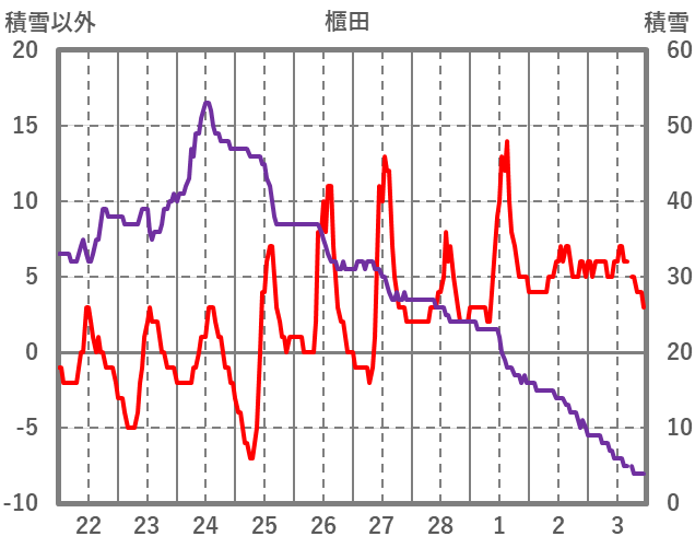 | 日 | 時 | 気温 | 降水 | 風向/風速 | 日照 | 積雪 | 降雪 |