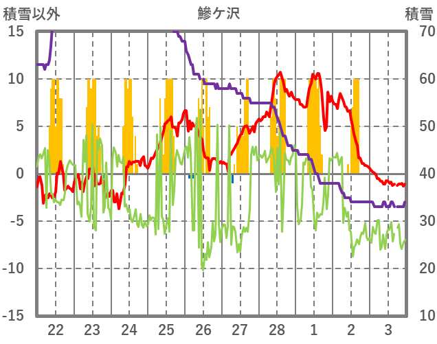 | 日 | 時 | 気温 | 降水 | 風向/風速 | 日照 | 積雪 | 降雪 |