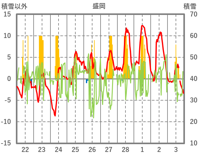 | 日 | 時 | 気温 | 降水 | 風向/風速 | 日照 | 積雪 | 降雪 |