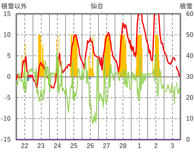 | 日 | 時 | 気温 | 降水 | 風向/風速 | 日照 | 積雪 | 降雪 |