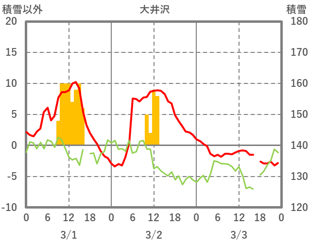 | 日 | 時 | 気温 | 降水 | 風向/風速 | 日照 | 積雪 | 降雪 |