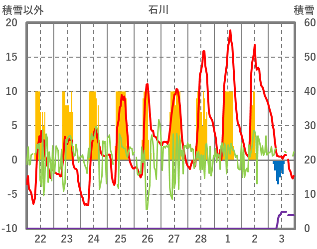 | 日 | 時 | 気温 | 降水 | 風向/風速 | 日照 | 積雪 | 降雪 |