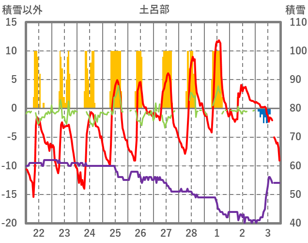 | 日 | 時 | 気温 | 降水 | 風向/風速 | 日照 | 積雪 | 降雪 |