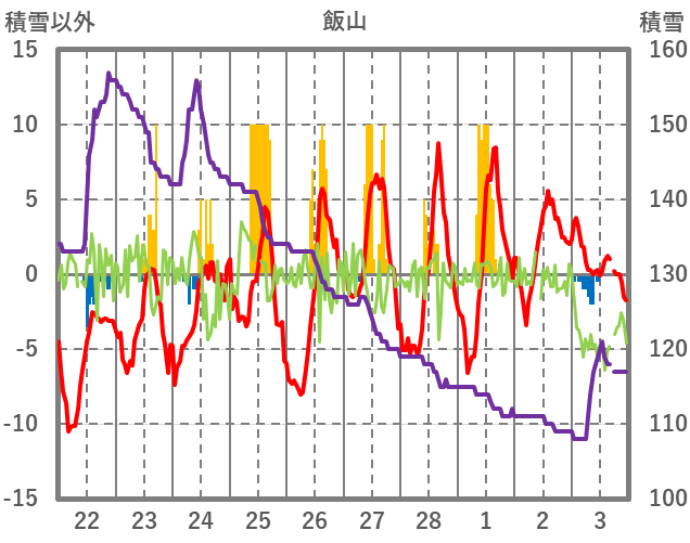 | 日 | 時 | 気温 | 降水 | 風向/風速 | 日照 | 積雪 | 降雪 |