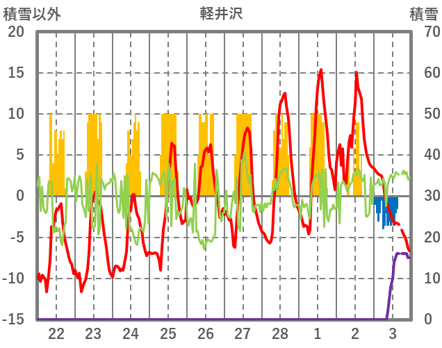 | 日 | 時 | 気温 | 降水 | 風向/風速 | 日照 | 積雪 | 降雪 |