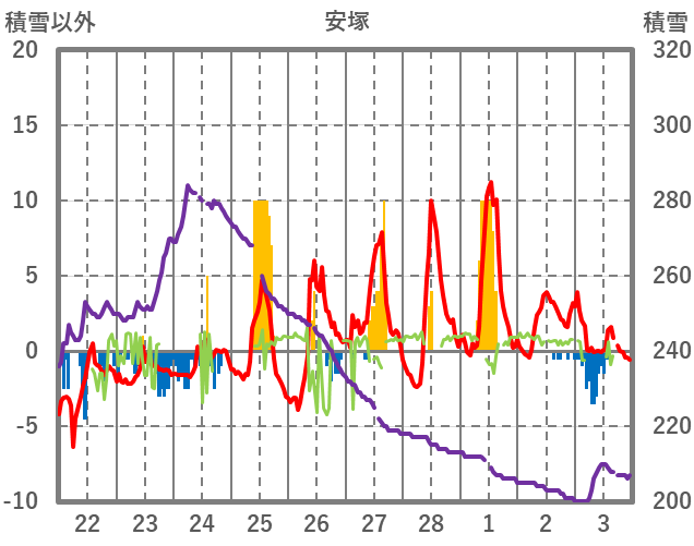 | 日 | 時 | 気温 | 降水 | 風向/風速 | 日照 | 積雪 | 降雪 |