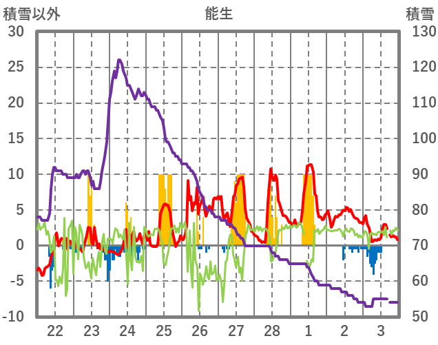 | 日 | 時 | 気温 | 降水 | 風向/風速 | 日照 | 積雪 | 降雪 |