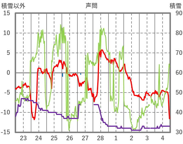 | 日 | 時 | 気温 | 降水 | 風向/風速 | 日照 | 積雪 | 降雪 |