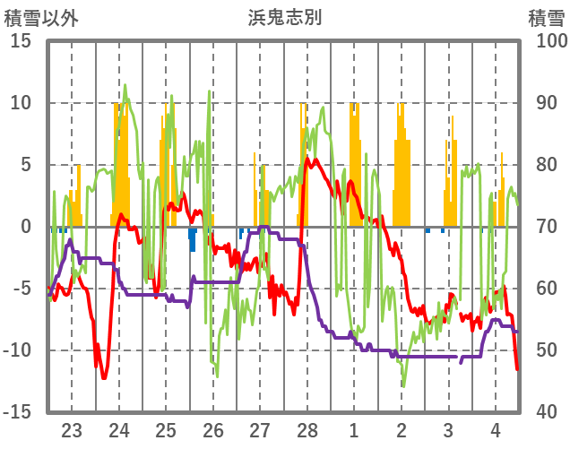 | 日 | 時 | 気温 | 降水 | 風向/風速 | 日照 | 積雪 | 降雪 |