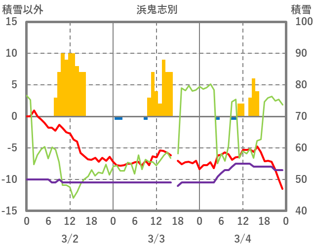 | 日 | 時 | 気温 | 降水 | 風向/風速 | 日照 | 積雪 | 降雪 |