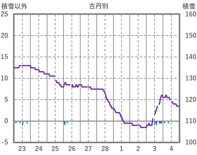 | 日 | 時 | 気温 | 降水 | 風向/風速 | 日照 | 積雪 | 降雪 |