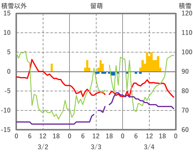 | 日 | 時 | 気温 | 降水 | 風向/風速 | 日照 | 積雪 | 降雪 |