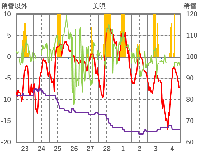 | 日 | 時 | 気温 | 降水 | 風向/風速 | 日照 | 積雪 | 降雪 |