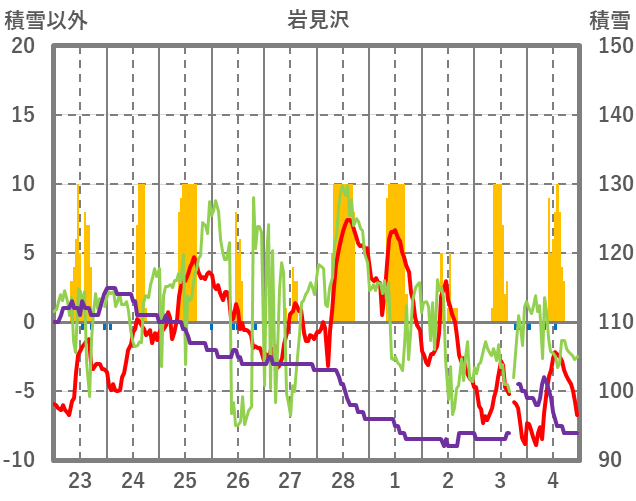 | 日 | 時 | 気温 | 降水 | 風向/風速 | 日照 | 積雪 | 降雪 |