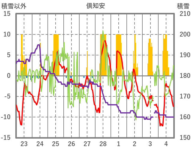 | 日 | 時 | 気温 | 降水 | 風向/風速 | 日照 | 積雪 | 降雪 |