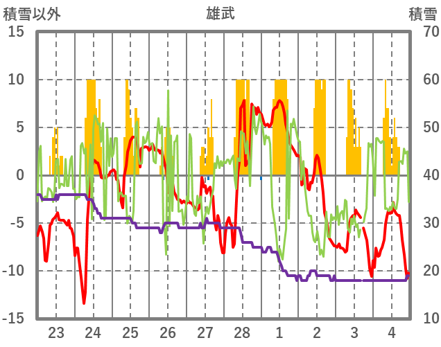 | 日 | 時 | 気温 | 降水 | 風向/風速 | 日照 | 積雪 | 降雪 |
