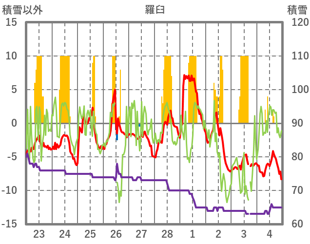 | 日 | 時 | 気温 | 降水 | 風向/風速 | 日照 | 積雪 | 降雪 |